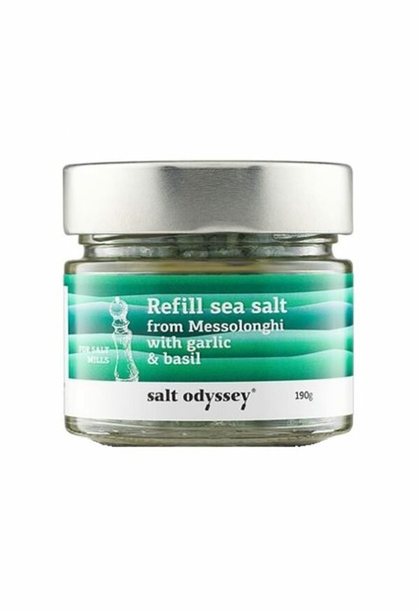 Reines Messolonghi-Meersalz mit Knoblauch und Basilikum, Nachfüllpackung für die Salzmühle. Es ist ein natürliches, rein schmeckendes grobes Meersalz und verleiht Ihnen den unkomplizierten Salzgeschmack, den Sie bisher vermisst haben. Das Meersalz entsteht in den Salinen von Messolonghi, einem unverschmutzten Gebiet, das durch die Ramsar-Konvention geschützt ist. Eine natürliche Quelle lebenswichtiger Elemente für eine gute Gesundheit und eine reichhaltige Geschmackspalette für den Gourmet dieser Welt! Passt perfekt für Saucen, Pesto, Hühnchen, Fisch und andere Meeresfrüchte und Nudeln.